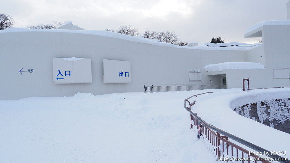 ホッキョクグマ館出口周辺は、リラの出産準備のために閉鎖されていますが、今回の大雪で立ち入り禁止のバリケードさえ雪にすっぽり覆われてしまいました。除雪車も通らないようで、人止め柵が低く感じてしまいます。