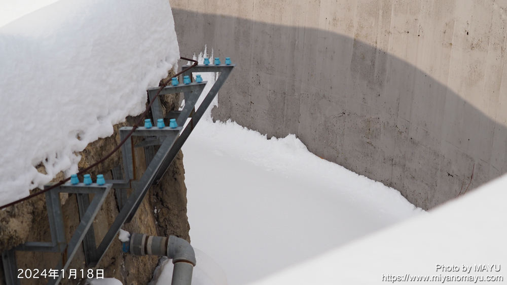 プールの上には厚い氷の上にさらに積雪し、水中トンネル内が薄暗くなっています。