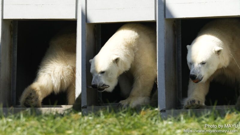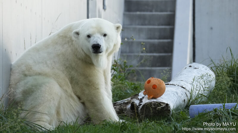 9月24日(水・休園日)と9月30日(火)ということになり、それ以外は寝室とサブ放飼場で過ごしていたということになります。ホッキョクグマ館のメイン放飼場とサブ放飼場は土と草地がある場所なので、ララはしばらくの間楽しんで来られたのかな?と想像します。