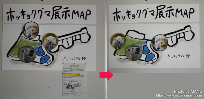 ホッキョクグマ展示MAPも今まで通りの配置となり、ホッキョクグマ館ではリラとライトが交替展示、ララは旧世界の熊館で展示となります。円山動物園では基本的に寝室扉は開放されているため、屋内に入っている時間は観られません。
