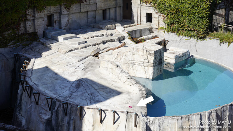 10月7日(火)に水換えが行われたプールはきれいなまま。矢印の場所にはピンクの輪っかが見えます。