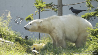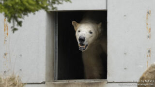 今朝は昨夕からの継続で、リラがメイン放飼場に出ていましたが、朝の給餌(9時50分)のタイミングで、ライト(写真/オス/12歳)に交替となりました。最近のホッキョクグマたちは、プールに入る回数が減っているようで、毛が乾ききっていたり、薄汚れた状態が続いています。
