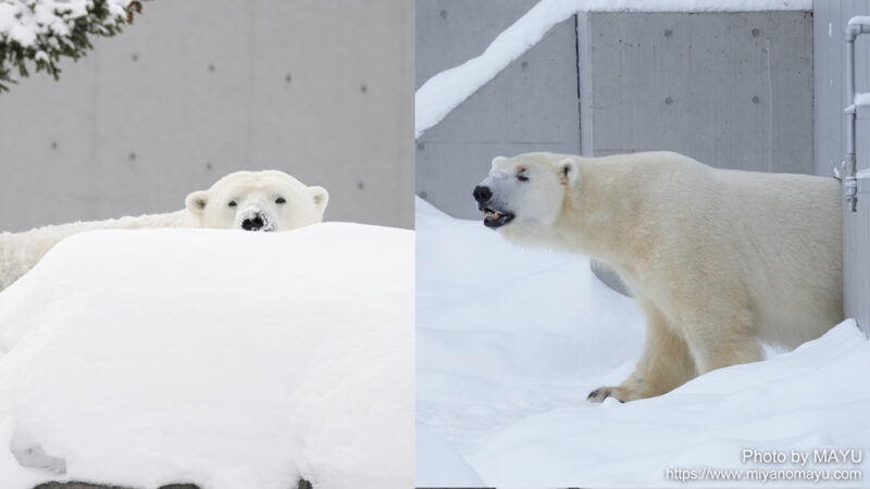 同居初日は20分程で終了し、13時30分からはいつものリラにも会え、無事に瞬間同居を終えてほっとひと安心。放飼場にはふかふかの雪が積もっており、プールには氷が張っていましたが、リラはプールに入ることなく閉園時間となりました。