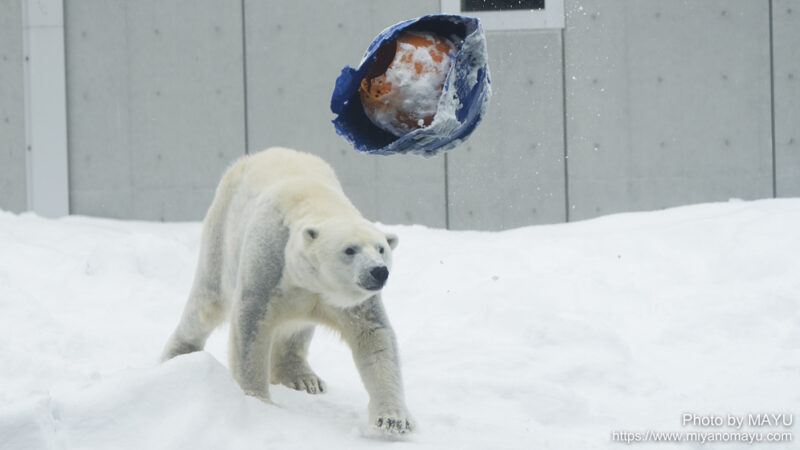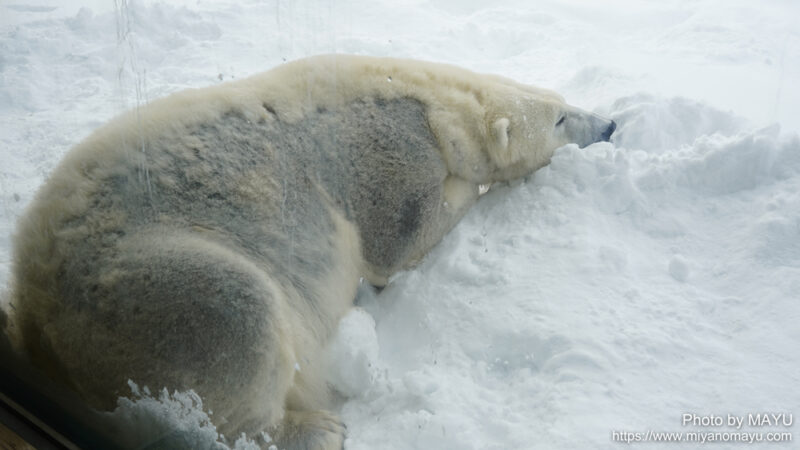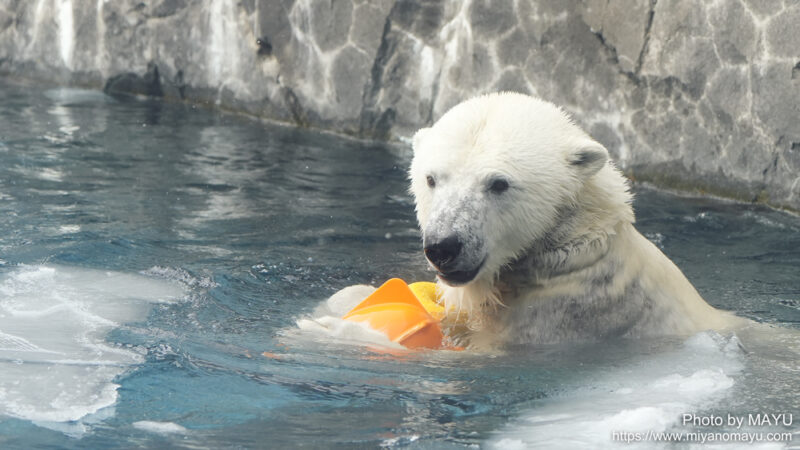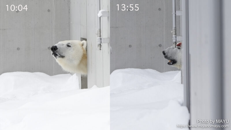 昨夜から開園前までは、ライトがメイン放飼場で過ごしており、開園直前にはプールで泳ぎ、アザラシプールに近づいたり、氷を触ったり、楽しんでいたとのこと。そんな姿こそ見てみたいのですが、なかなか見せてはくれないシャイな男ライトです。