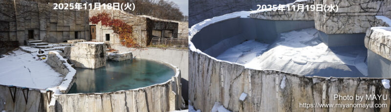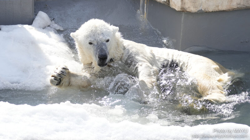 雪がまだ溶け残るプールへの注水の目的は、主に雪を溶かすためで、溶かした後は4ヶ月分の汚れを落とし、改めて注水されます。そのため雪が残ったプールに入るララの姿を観られるのは、期間限定となります。
