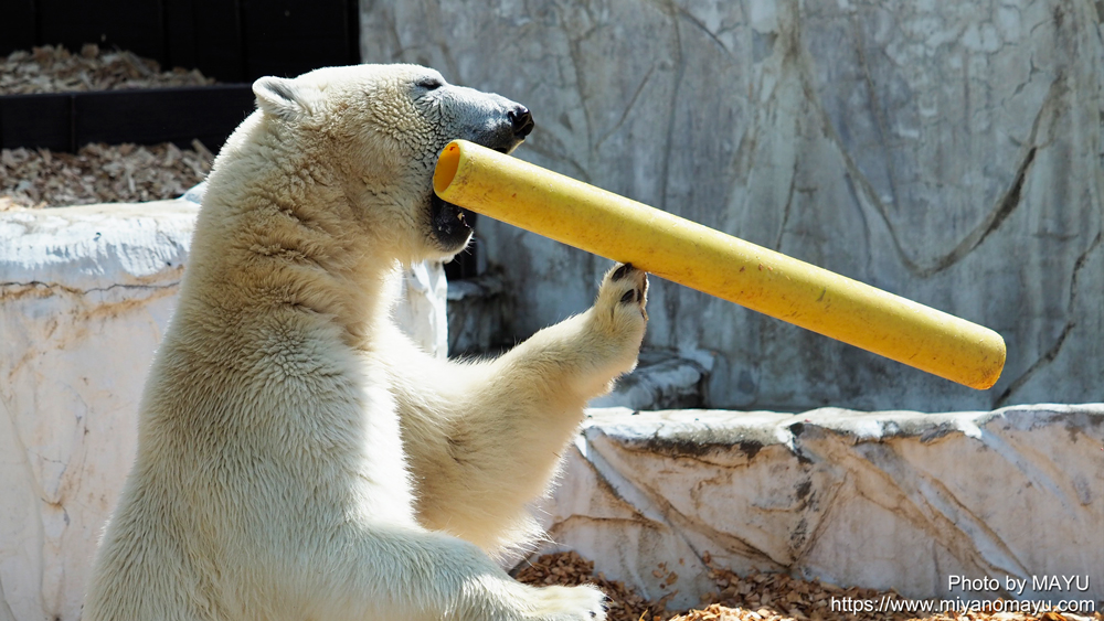 ガス管の中に少し残っているだろう肉を、なかなか諦められないフブキ。ウッドチップの堰き止め板を背もたれにして座っている姿が、なんとも愛くるしい。男鹿水族館の水槽側でもたれて座っていた赤ちゃん時代を思い出し、ちょっと懐かしくなりました。