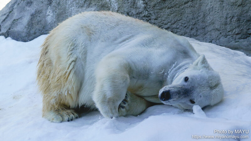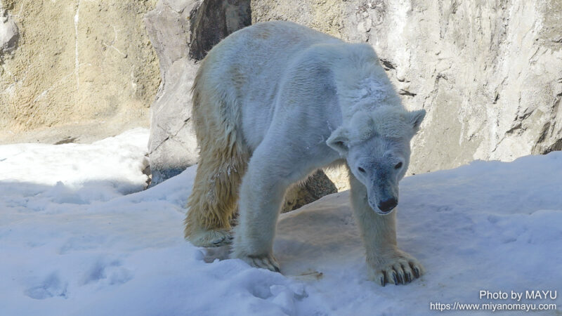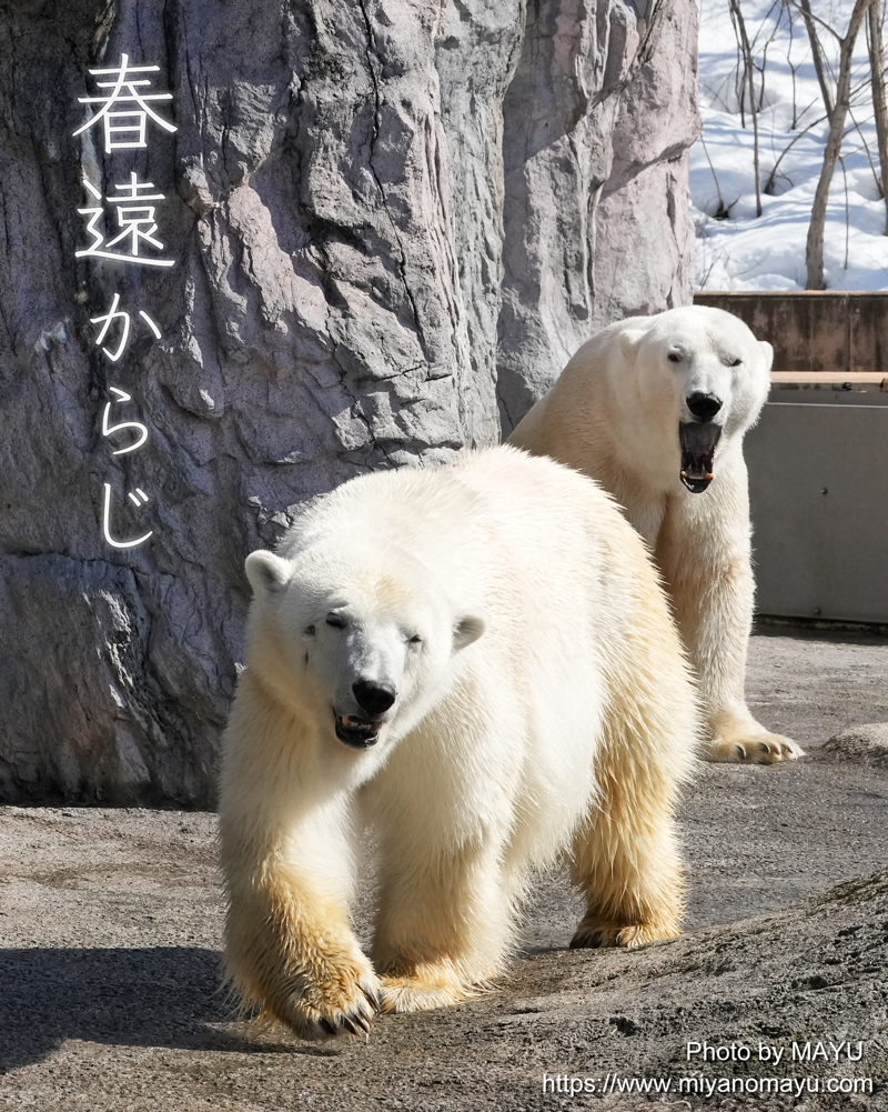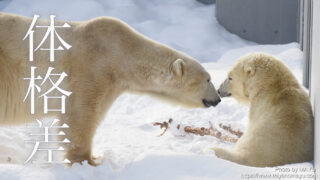 遅くなりましたが、2026年初訪問の旭山動物園。園内の雪もかなり解けており、歩きやすい園路になっていました。ホッキョクグマのピリカ(手前/メス/20歳)とホクト(奥/オス/25歳)は、繁殖のため同居中。2頭の間には2021年12月10日に第1子となるゆめ(メス)が誕生しており、再びの繁殖成功が期待されています。