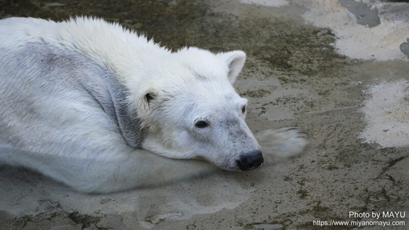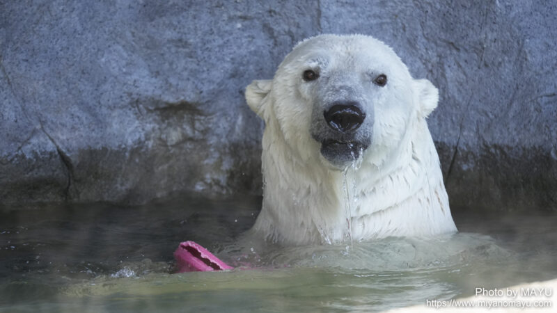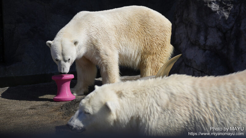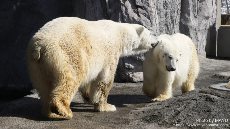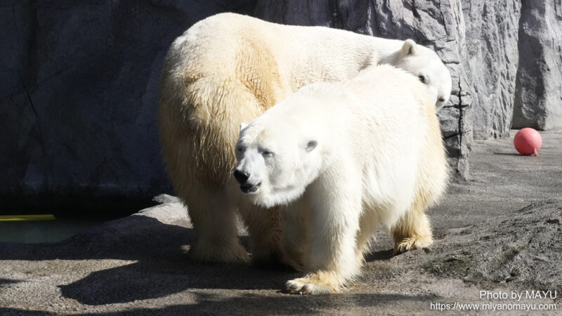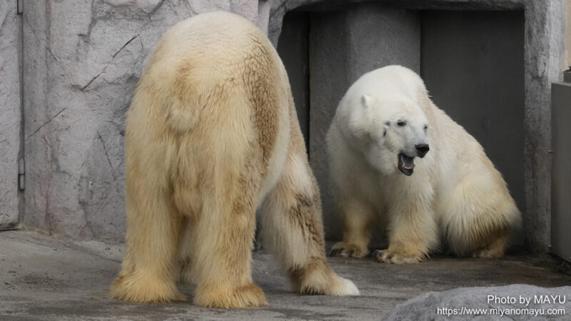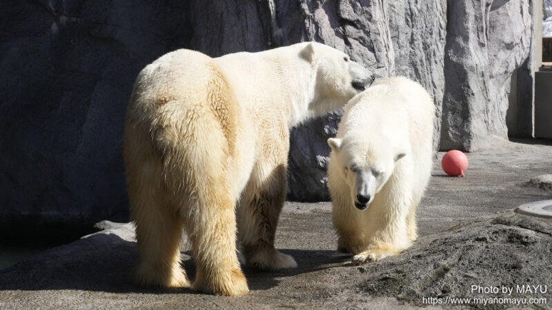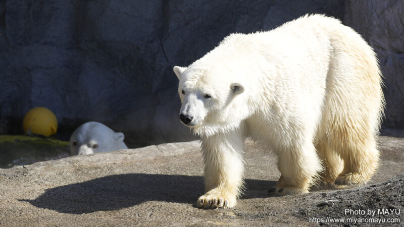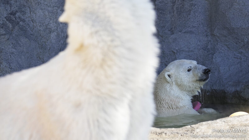 開園してまっすぐほっきょくぐま館へ向かうと、2頭とも水から上がったばかりのようで、体から水が滴っていました。再び入らないかな?と期待しながら待つと、時間をおいて数回水に入りました。2頭でじゃれる時間は短かったのですが、観ることが出来て嬉しかったです。