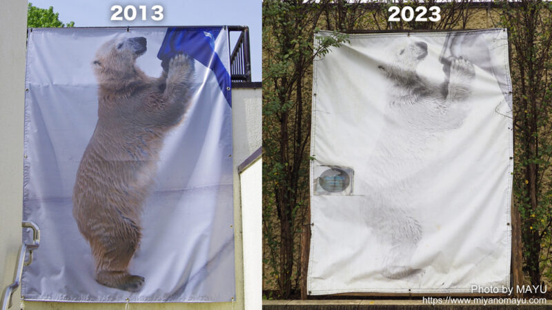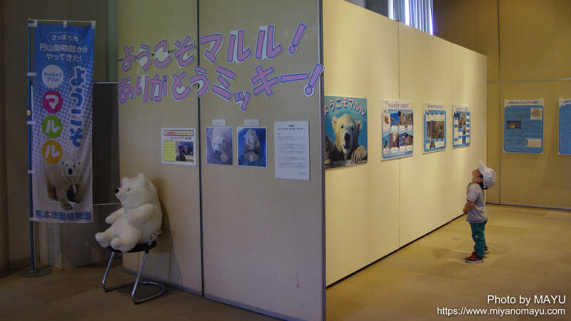 マルルが熊本市動植物園に移動して間もない頃は、のぼりがたくさん立てられたり、歓迎する展示などがいろいろありました。こういう気持ちが温かくなる展示は、釧路市動物園も得意。