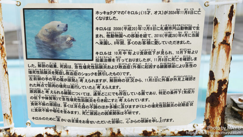 釧路市動物園には、昨年までキロル(2008.12.09–2024.11.08)というオスのホッキョクグマが暮らしていました。キロルはマルルの実兄。