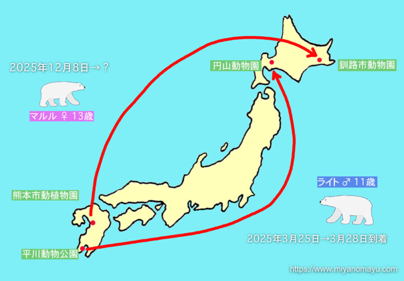 九州から北海道へはかなり遠方となります。マルルが1歳の時に移動した頃は飛行機が使われましたが、最近は陸路+海路のパターンが多い気がします。どのルートを使われるかは未発表ですが、時間がかかることは必至。