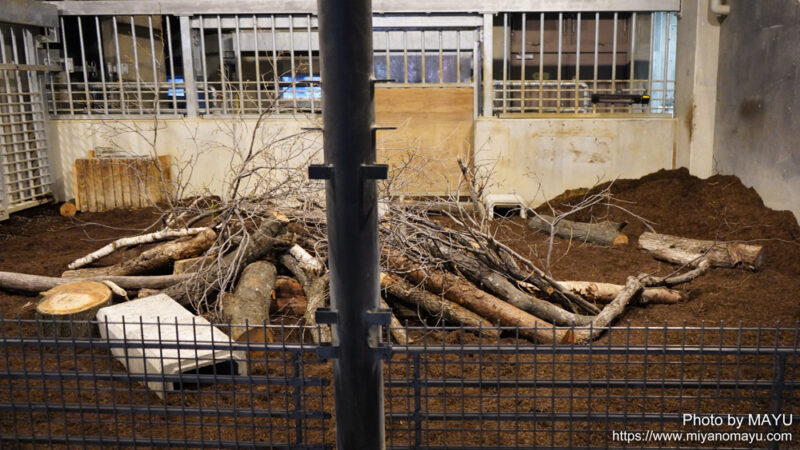 床の上には砂利が敷かれ、その上にゾウの堆肥がたっぷり敷き詰められていましたが、今は石がごろごろと混ざった状態になっています。毎晩のようにタータが土を掘り起こし、朝になれば飼育員さんが少し整地するというのを繰り返しているようです。
