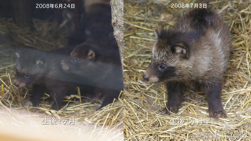 生まれた当初はほぼ黒毛に覆われていた子タヌキたちも、1ヶ月を過ぎるあたりから少しずつ茶色の毛が伸び始めてきました。同じイヌ科のシンリンオオカミの成長過程とよく似ています。