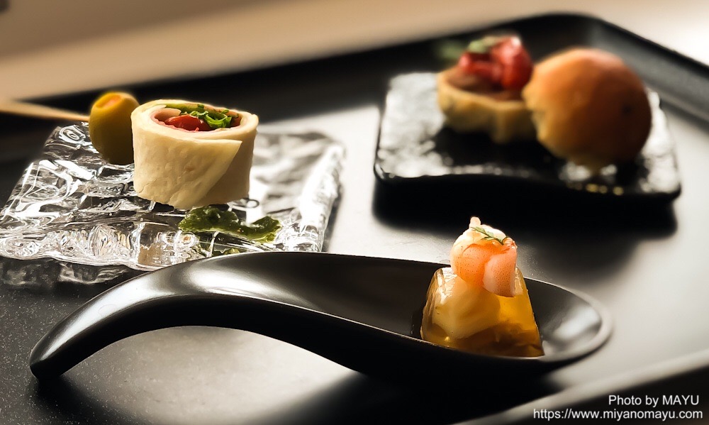 ホタテの煮凝り、ハモンセラーノのロールトルティーヤ、米粉パンのミニバーガーピンチョス。