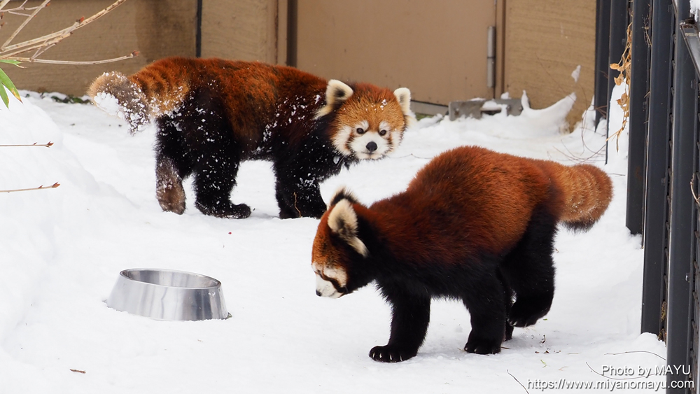 大森山動物園から来園した小百合(左/メス/7歳)と、旭山動物園から来園したプーアル(右/オス/8歳)の繁殖のための同居が始まり、その様子が12月28日(木)より公開されています。円山動物園は、2007年10月23日にメスのココ、2008年6月28日にオスのセイタを導入して以降、その2頭の血縁で繁殖を進められてきましたが、今回からは新たな血縁となります。レッサーパンダの繁殖時期は冬。小百合とプーアルの相性はいかに?注目されている円山動物園 高山館のレッサーパンダ舎 屋外放飼場(熱帯雨林館側)です。