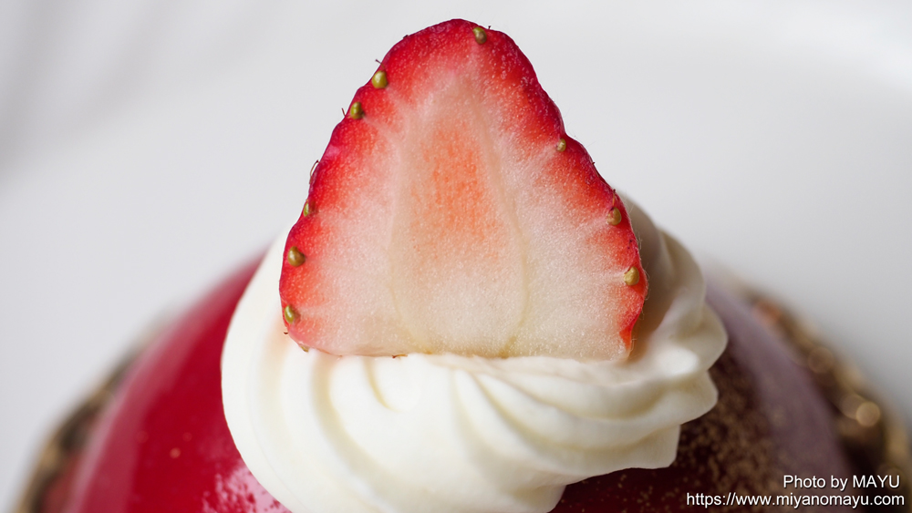 土台はスポンジ。土台の上にチョコレートムース、その周りを苺とフランボワーズ(ラズベリー)のムースでドーム型に作られています。甘さと酸味が程よく効いていて、とても美味しいケーキです。