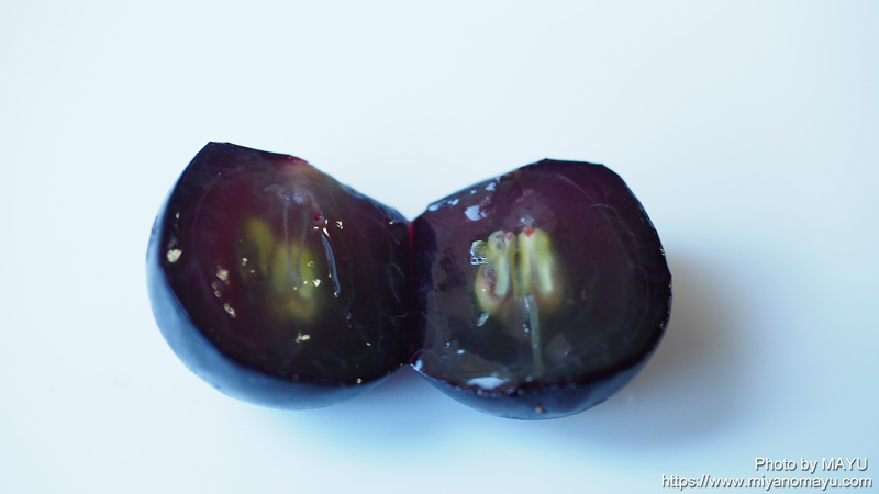 前日に見たテレビ番組で、「ブドウは種ありの方が甘くて安い」という内容を見たばかりだったので、妙に気になったぶどうの粒でした。