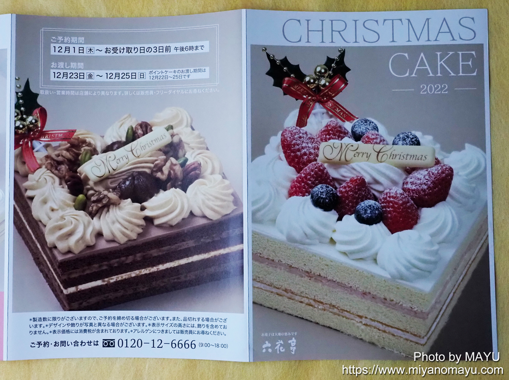 六花亭のクリスマスケーキ2022のリーフレットが店頭に置かれています。