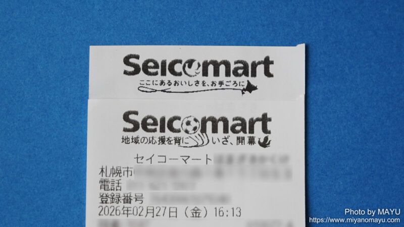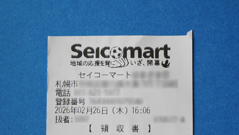セイコーマートはレシートのロゴマークで、北海道コンサドーレ札幌を応援。2026年2月26日のレシートには、「地球の応援を背に いざ、開幕」の文字。