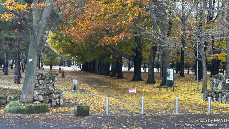 紅葉、落葉がきれいな円山公園ですが、今朝はひっそりとして誰もいません。立ち入りが制限されています。公園内に潜んでいるのでは?とつい覗き込んでしまいました。