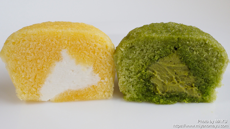 断面を見ると、注入された感じがよくわかります。黄色の卵の生地にはミルククリーム、濃い抹茶生地には抹茶クリームが入っています。抹茶クリームは濃厚で、少しチーズの風味にも感じます。