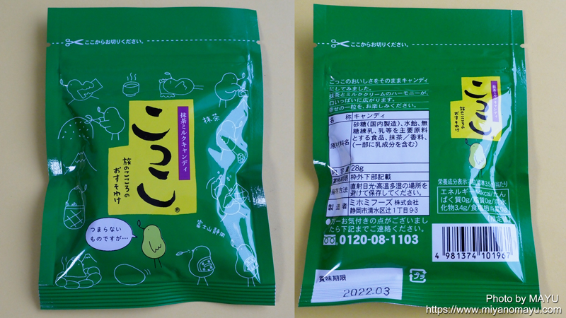 28g入りのパッケージの中に、9粒+半かけ1粒。1粒標準3.5gあたり14kcal。パッケージには「つまらないものですが・・・」とありますが、なかなかどうして、美味しい飴です。にこにこセットに入ってなければ食べてみなかったでしょうから、にこにこセット販売は成功でしょう。次回は、違うこっこも試してみたいと思います。