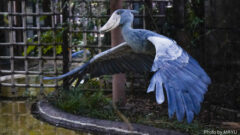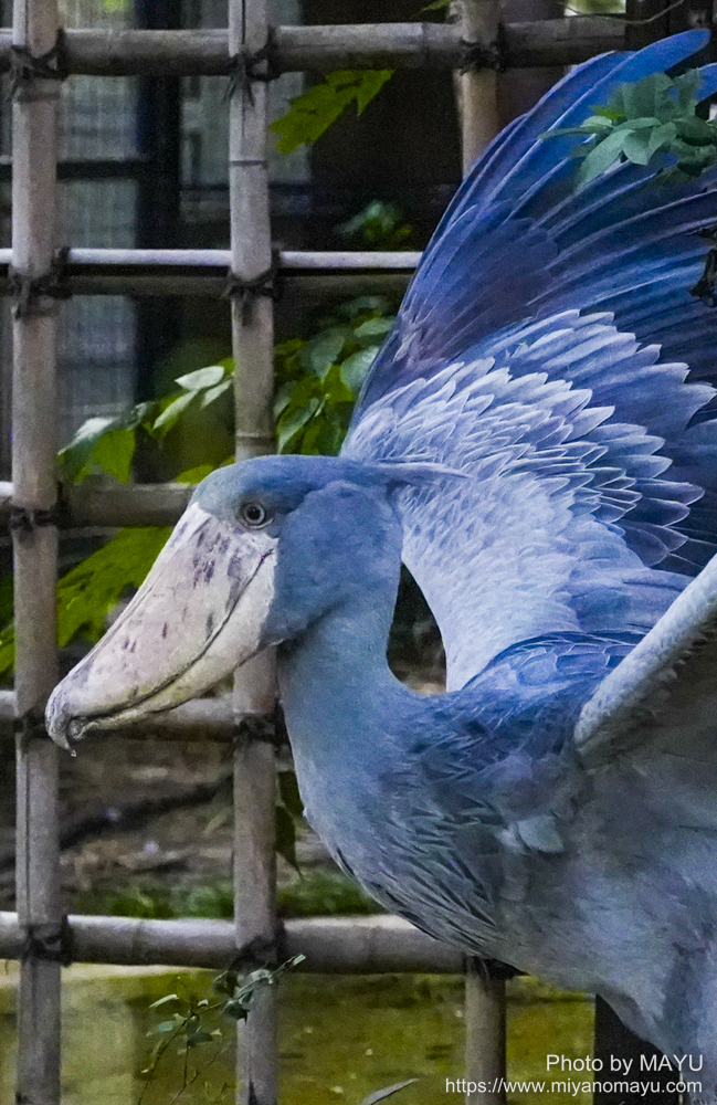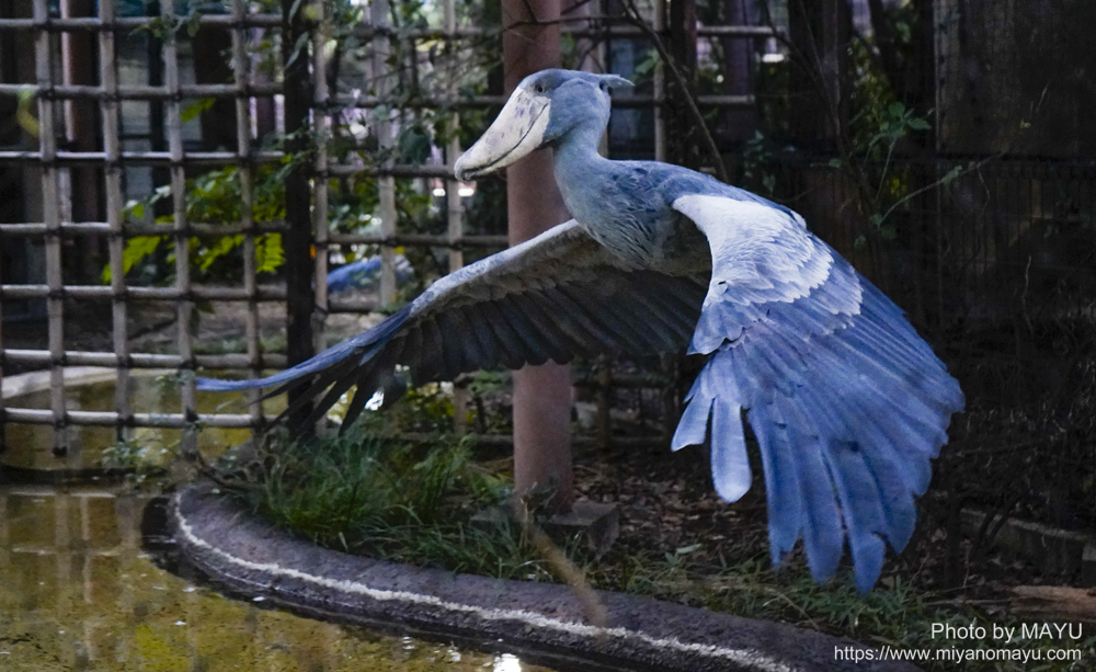 いつもはなかなかお目にかかれないハシビロコウの飛翔シーンですが、この日はタイミングよく、何度か羽ばたく様子を見ることが出来ました。やはり大きい鳥なので、翼をひろげると画角からはみ出てしまうなど、網越し+混雑している動物園での撮影の難しさを実感しました。