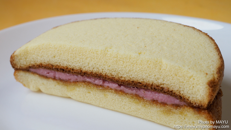 ヤマザキパンから発売されているサンドケーキと形態はよく似ていますが、スポンジの食感、厚さ、クリーム、ざらめの違いがあり、それぞれに美味しいですね。