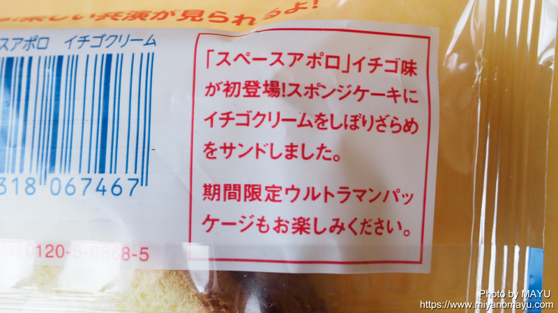 先日食べたスペースアポロという菓子パンです。昔、広島のナガイパンで発売されていたものをロバパン(フジパングループ)が再現されたそう。地元の人にとっては懐かしいパンでしょうね。初めて見る私は、珍しさでちょっとお試しです。スペースつながりなのか、今はウルトラマンとコラボしているようで、パッケージにはウルトラマン、ウルトラセブンが描かれていました。1つ98円(税別)で購入。