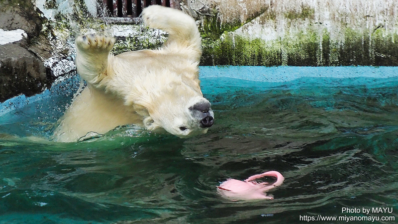 下からジャンプで落とす遊び。こういう形の場所を活かしたホッキョクグマらしい遊びですね。釧路市動物園のミルクだと、横からジャンプして叩き落とすという荒業も見せます。