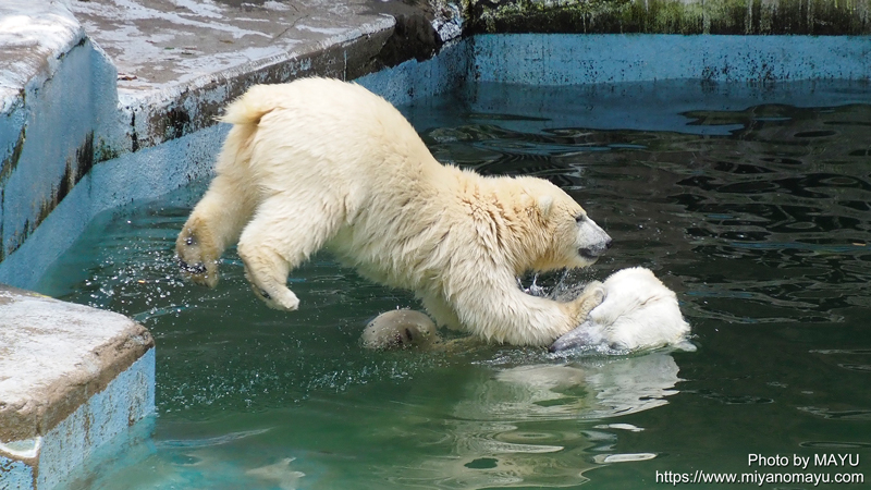 ※天王寺動物園では2020年11月25日に、ホッキョクグマの赤ちゃんが誕生(父ゴーゴ・母イッちゃん)。2021年3月23日から一般公開が始まりましたが、親子の体調管理のために一時的に展示をお休みしたり、コロナ禍のための臨時休園期間があったり(2021年4月24日〜6月21日)、台風9号接近で臨時休園にあったり(8月9日)、現在はホウちゃんの足の捻挫による安静期間で展示休止中(8月13日〜23日)、訪問には事前チェックをお忘れなく。