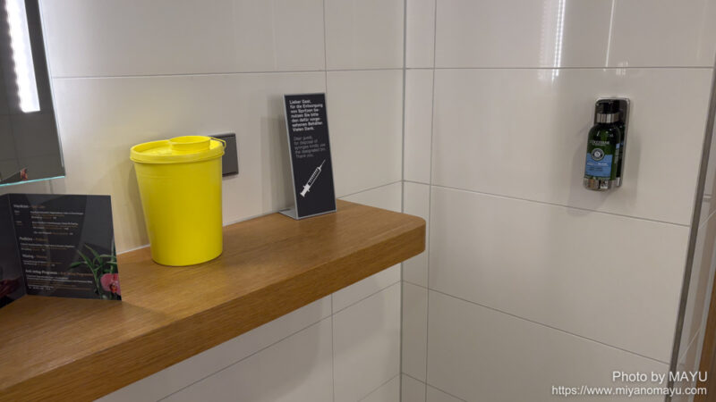 ラウンジのトイレ。ボディローション(右)があるのは珍しくないですが、初めて見たのは黄色いバケツ。注射器を廃棄するバケツのようです。