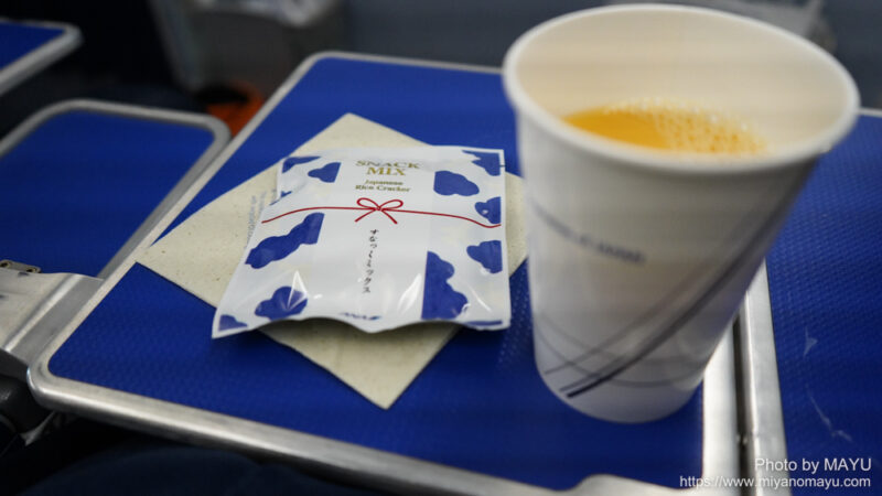 離陸からしばらくすると、ドリンクとスナックのサービスがありました。最近パッケージが変わったスナックミックス。