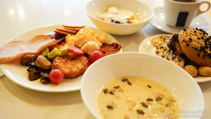ドリンク、フルーツ、シリアル、サラダなど、バラエティに富んでいました。今回の宿泊先のメニューに必ず登場していて、とても気に入ったメニューは、サーモンクリーム(クリームチーズ+わさび)を添えたもの。↑写真の場合、左端に写っているのが薄切りサーモン。クリームは別に用意されていて、好きなだけトッピング。