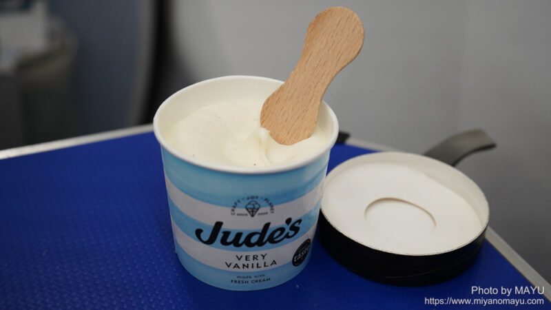 帰りのデザートは、いつものイギリスのアイスクリームブランドJude’s(ジュース)のバニラアイス。今回は程よい硬さのタイミングで提供されました。蓋の裏に木べらが付属としてありますが、スプーンで食べた方が、食べやすいと思います。