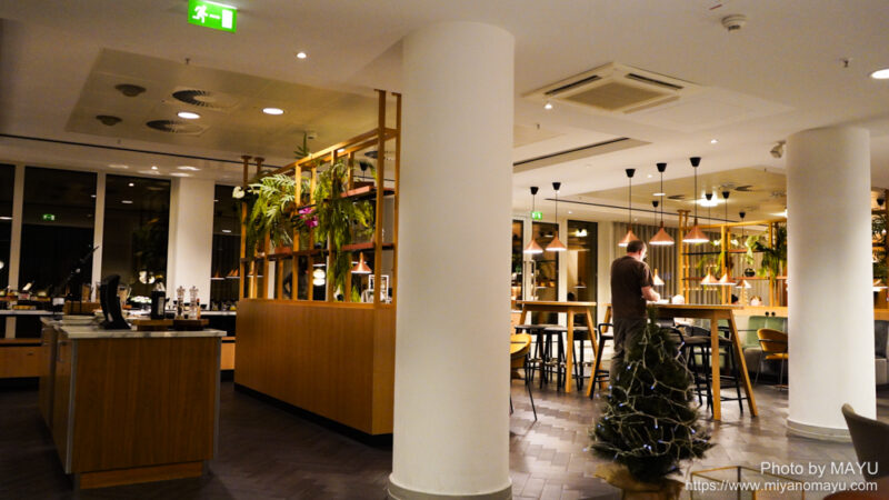 朝6時30分。宿泊ホテルのラウンジで軽く食事。日の出前なので夜の雰囲気です。