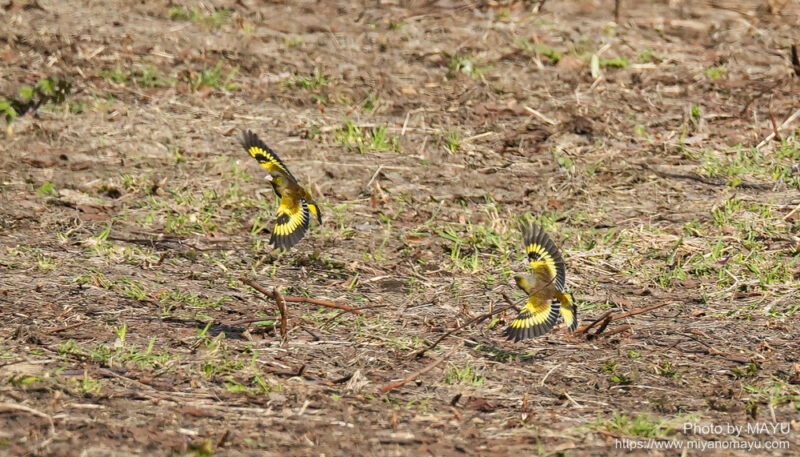 地面近くを飛び回っていたカワラヒワ2羽。もう少し近づきたいものの、あまりに開けた場所だったため、遠くから見ていました。
