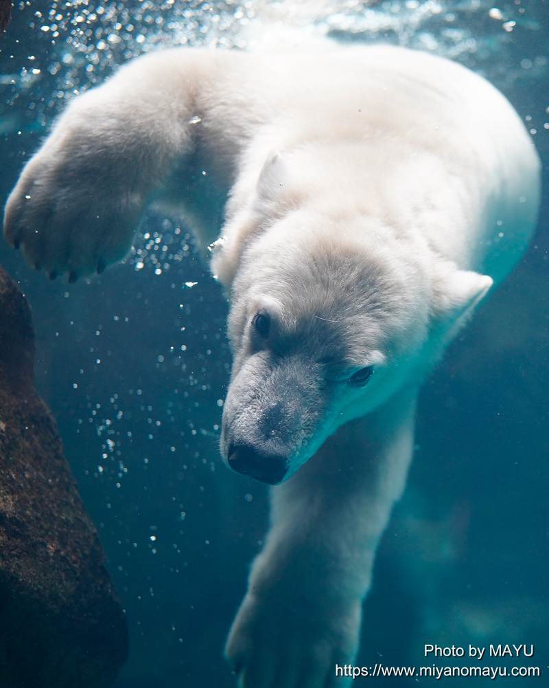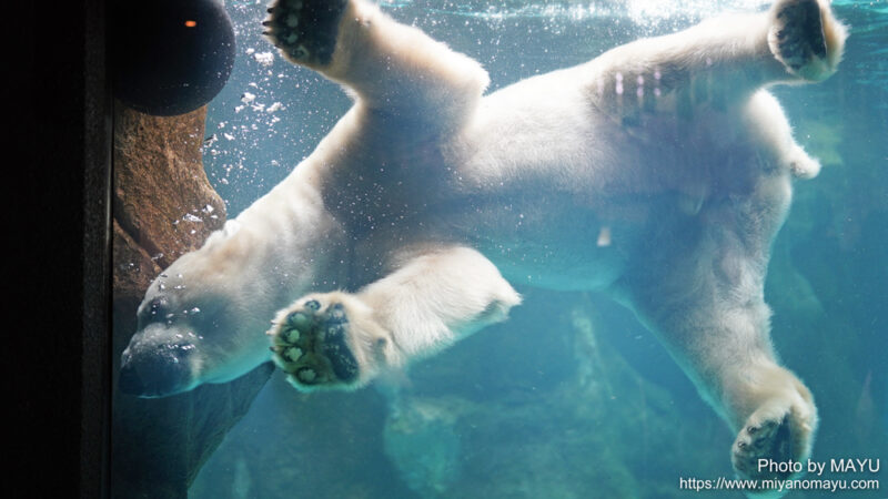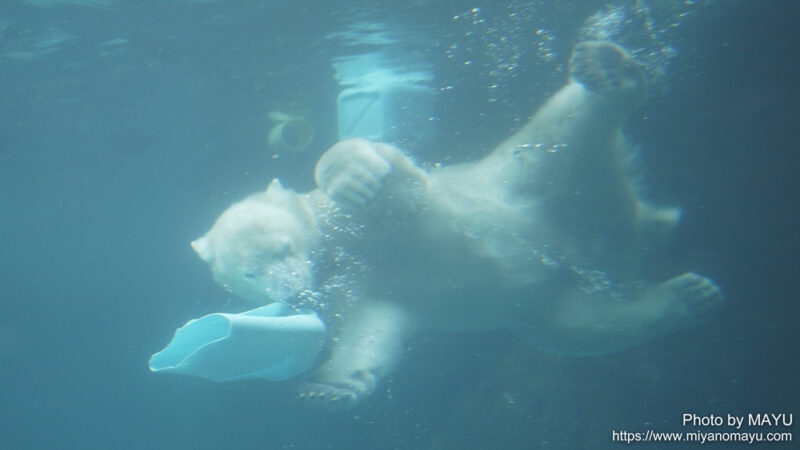 10月29日(水)は、9時30分の開園と同時に入園し、ホッキョクグマ舎に向かうと、ゴーゴ(オス/20歳)が放飼場に出ており、すでにプールに入っている状態でした。ズーラシアで朝のゴーゴに会うのは初めてなので、とても新鮮でした(いつも午後ゴーゴでした)。水中ビューのエリアでは、おもちゃをカコンカコンとぶつけながら、ダイナミックに遊ぶ様子をたっぷり見せてもらいました。